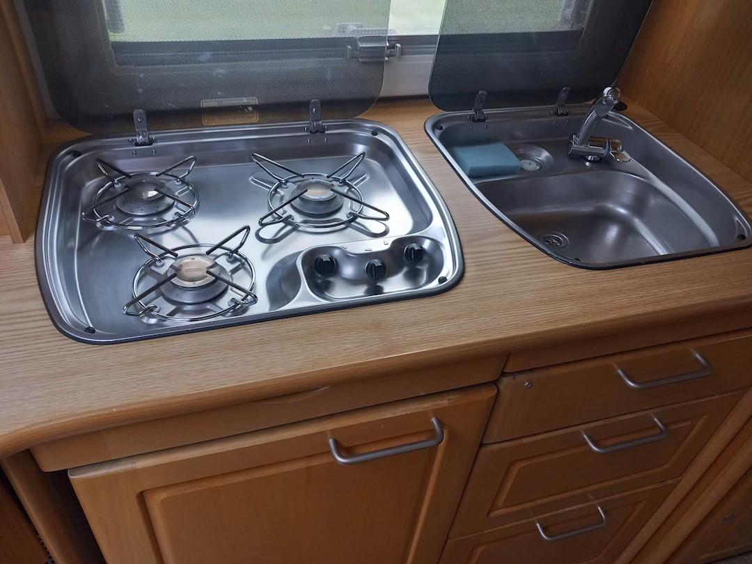 - ijskast, kookfornuis op gas, 1 gootsteen, warm water op elektriciteit, waterbak van 40 l